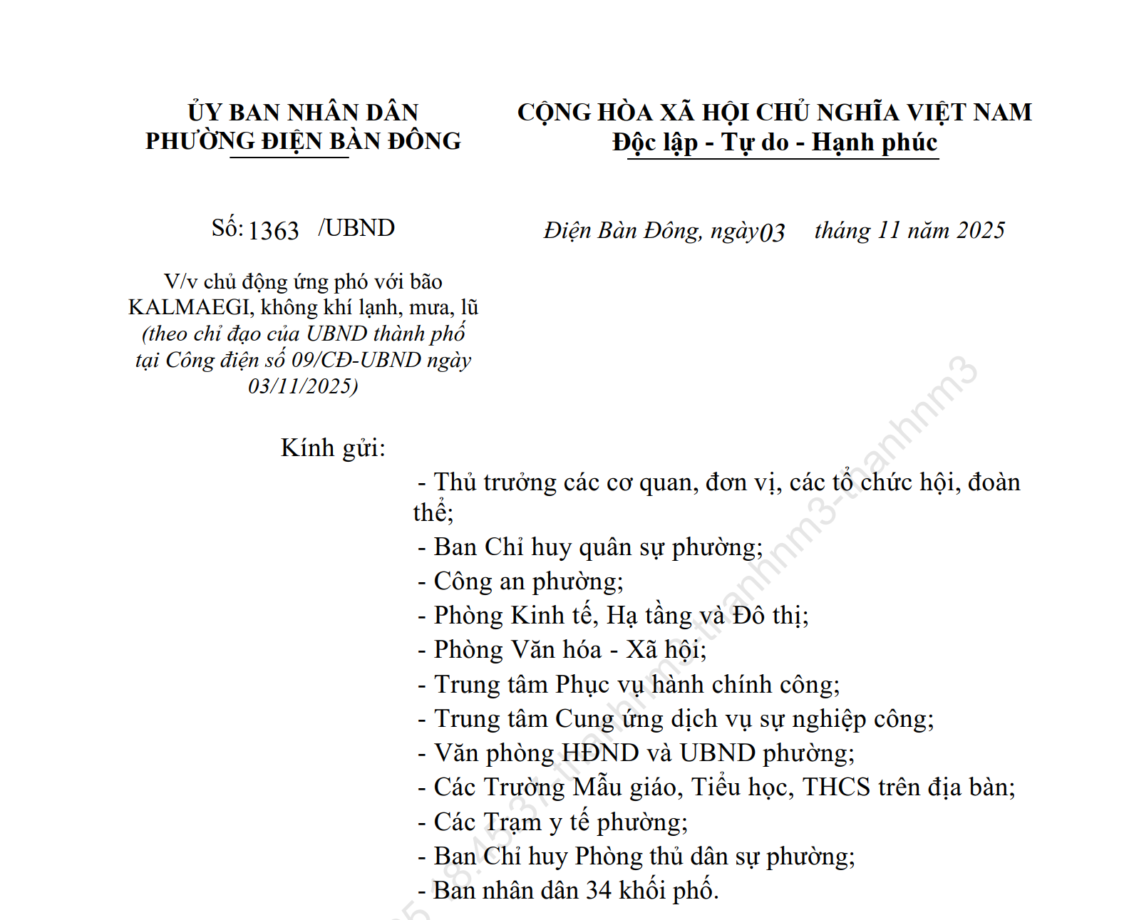 Thứ hai, 03/11/2025 | 18:50 A- A A+ | Chủ động ứng phó với bão KALMAEGI, không khí lạnh, mưa, lũ Công văn chủ động ứng phó với bão KALMAEGI, không khí lạnh, mưa, lũ Chia sẻ Lưu Tập tin đính kèm Trình duyệt không hỗ trợ iframe. Tổng số điểm của bài viết là: 2 trong 2 đánh giá Click để đánh giá bài viết