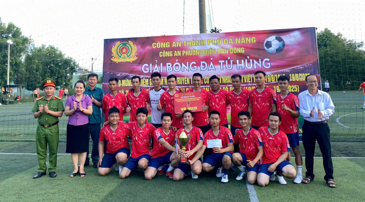 Ngày 14.8.2025, trong khuôn khổ các hoạt động chào mừng 80 năm ngày thành lập CAND (19/8/1945 – 19/8/2025) và 20 năm ngày hội toàn dân bảo vệ ANTQ (19/8/2005 – 19/8/2025), Chi đoàn Công an phường Điện Bàn Đông, Tp. Đà Nẵng tham mưu tổ chức giải bóng đá tứ hùng giữa các đội bóng: Công an phường, Liên quân Quân sự - Biên phòng, Đảng uỷ, UBND, MTTQ phường và đội bóng Tổ ANTT cơ sở.