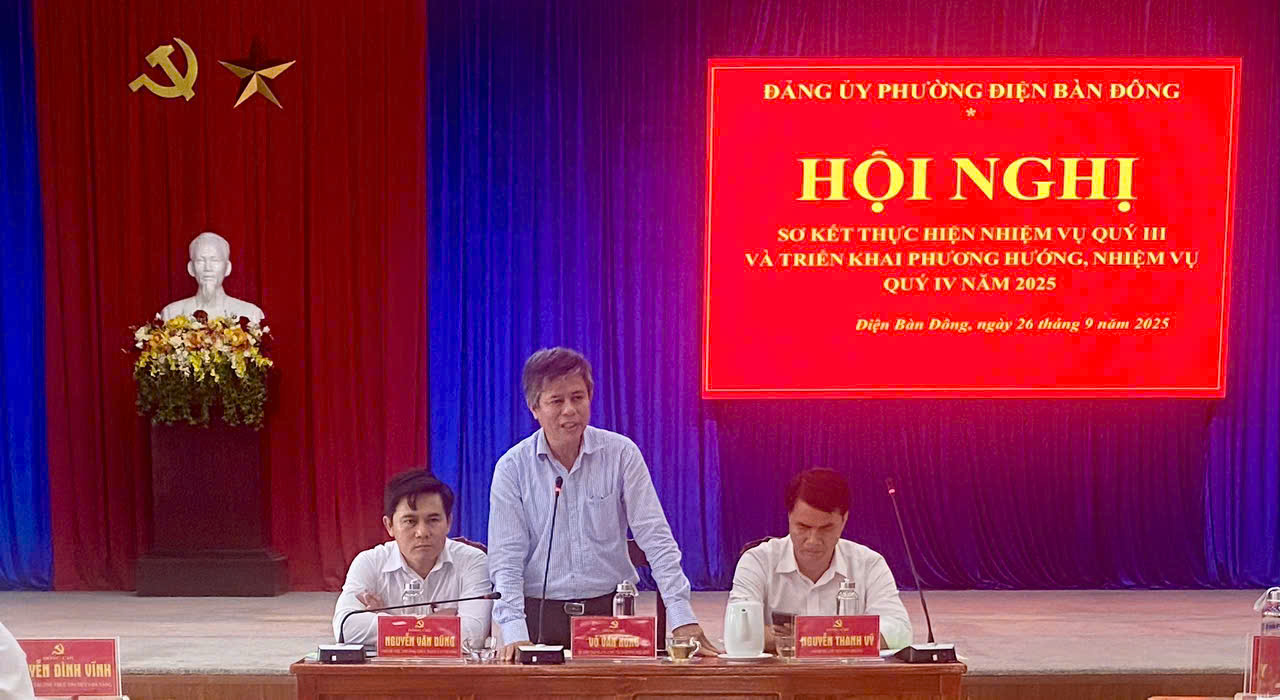 Sáng ngày 26.9, Đảng uỷ phường Điện Bàn Đông tổ chức Hội nghị sơ kết tình hình thực hiện nhiệm vụ quý III và triển khai phương hướng, nhiệm vụ quý IV năm 2025. Dự hội nghị có đồng chí Nguyễn Đình Vĩnh, PBT TT thành uỷ Đà Nẵng; các đồng chí lãnh đạo các cơ quan tham mưu, giúp việc thành uỷ; các đồng chí lãnh đạo BTV Đảng uỷ, HĐND, UBND, các cơ quan, đơn vị trên địa bàn phường, lãnh đạo 34 khối phố.