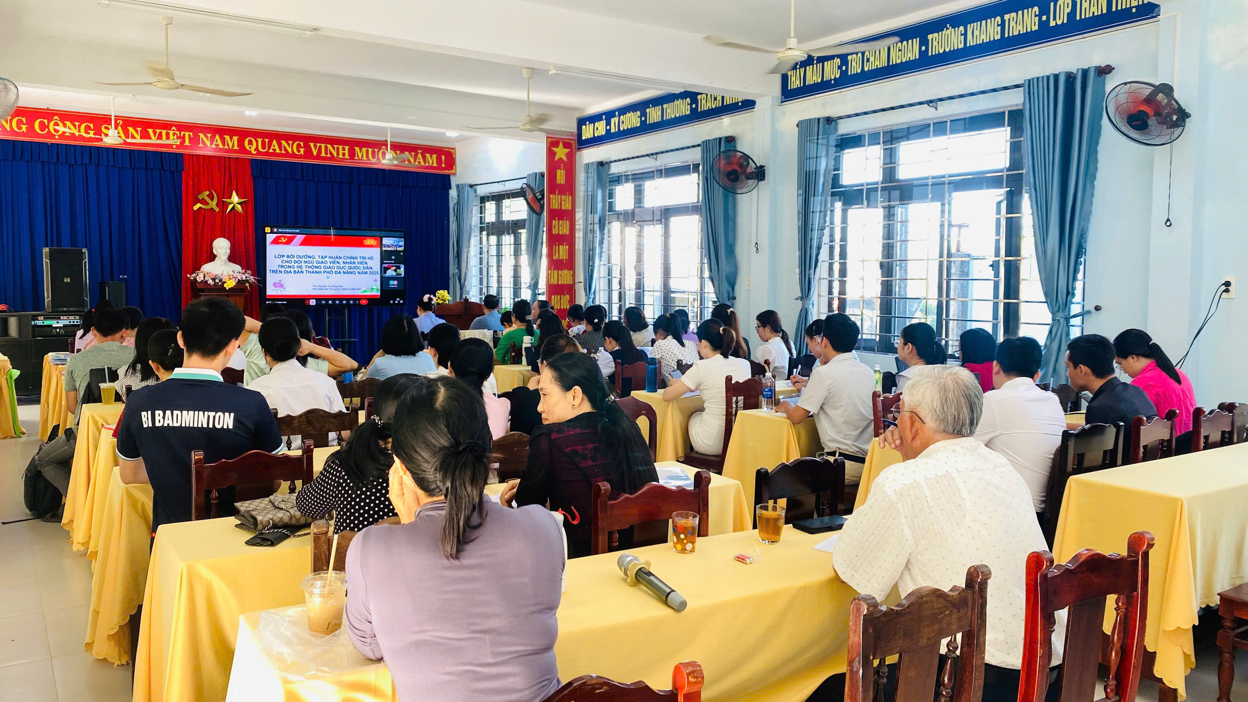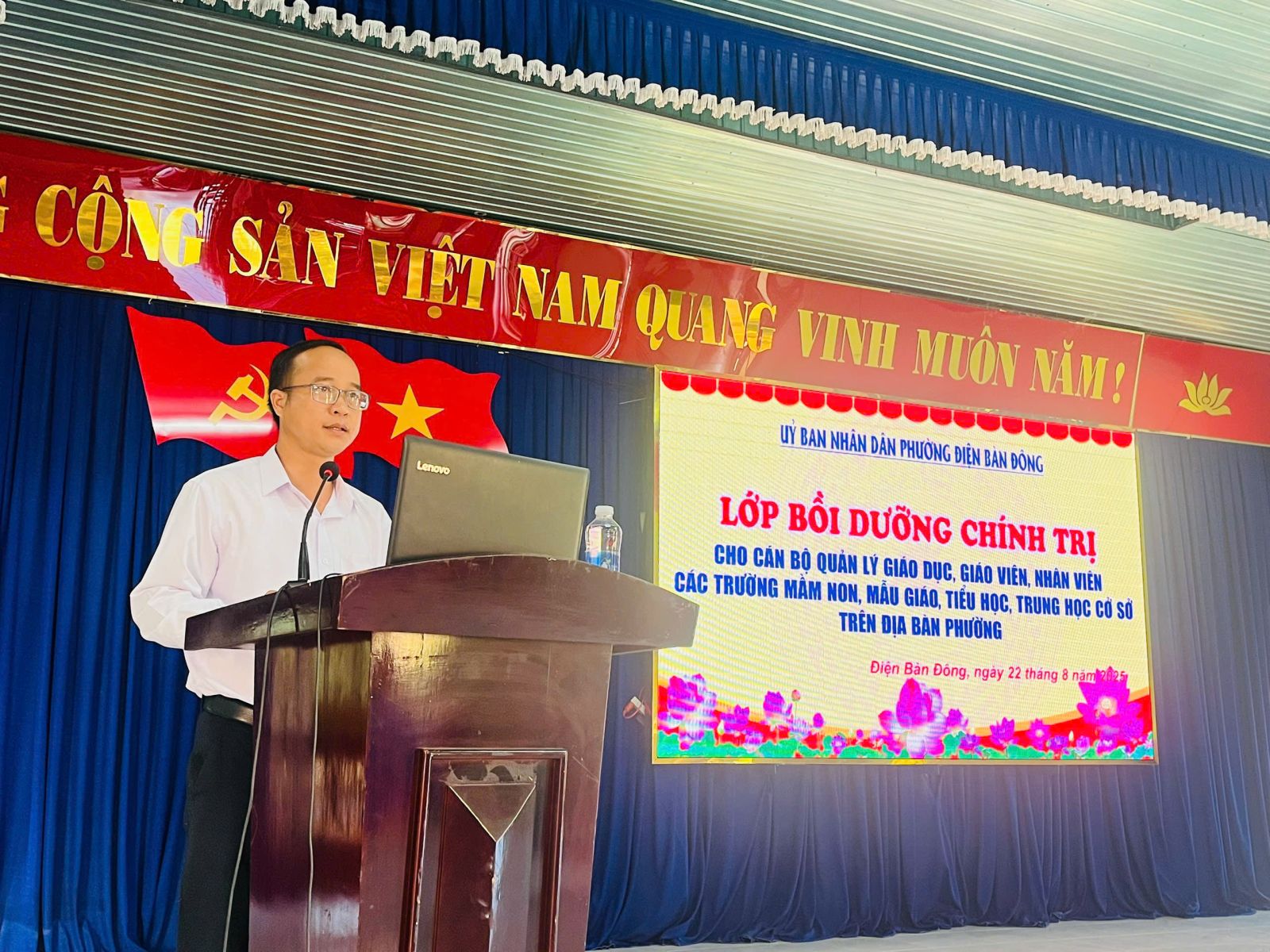 Sáng 22/8, phường Điện Bàn Đông tổ chức khai mạc lớp bồi dưỡng, tập huấn lý luận chính trị hè năm 2025 cho đội ngũ Cán bộ quản lý, viên chức và người lao động ngành giáo dục và đào tạo trên địa bàn. Tham dự Khai mạc có Đồng chí Nguyễn Văn Dũng - Phó bí thư thường trực đảng ủy, Đồng chí Lê Thanh Long - UVBTV , Phó Chủ tịch UBND phường, Đồng chí Trần Thị Thanh Vân - ĐUV, Trưởng phòng VH-XH phường và các học viên tại điểm cầu trung tâm và 14 điểm cầu trực tuyến tại các trường.