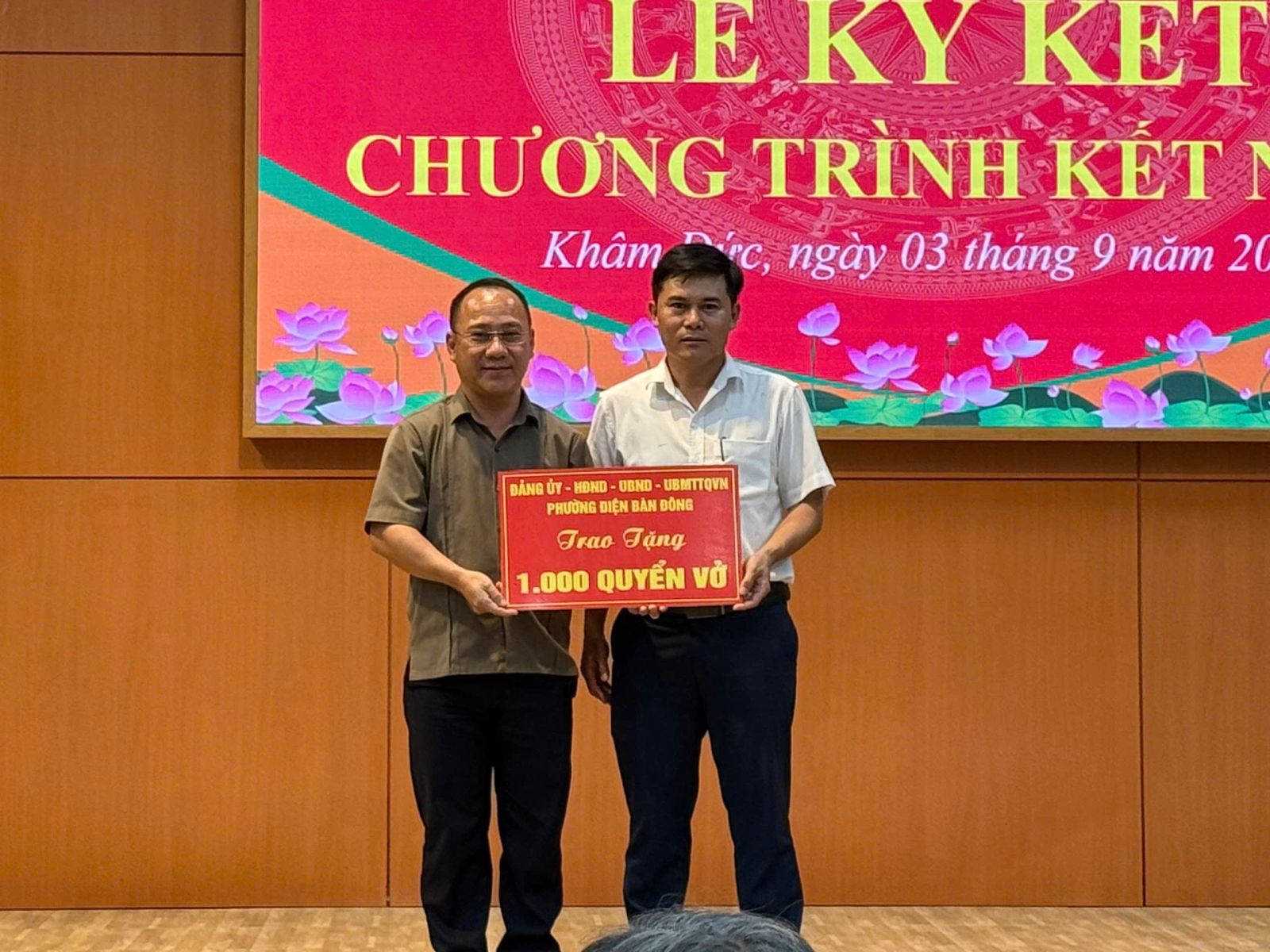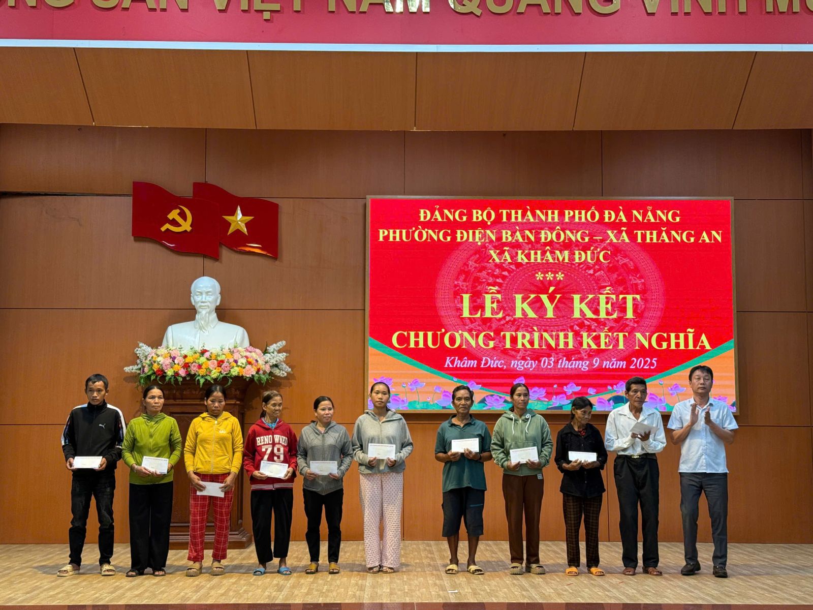 Trong khuôn khổ buổi lễ, phường Điện Bàn Đông đã trao tặng 20 suất quà cho các hộ nghèo và hỗ trợ một số vật dụng, thiết bị học tập cho trường học trên địa bàn xã Khâm Đức. Đây là những hành động cụ thể, thể hiện tinh thần trách nhiệm, nghĩa tình, tạo tiền đề cho mối quan hệ gắn bó lâu dài giữa hai địa phương.