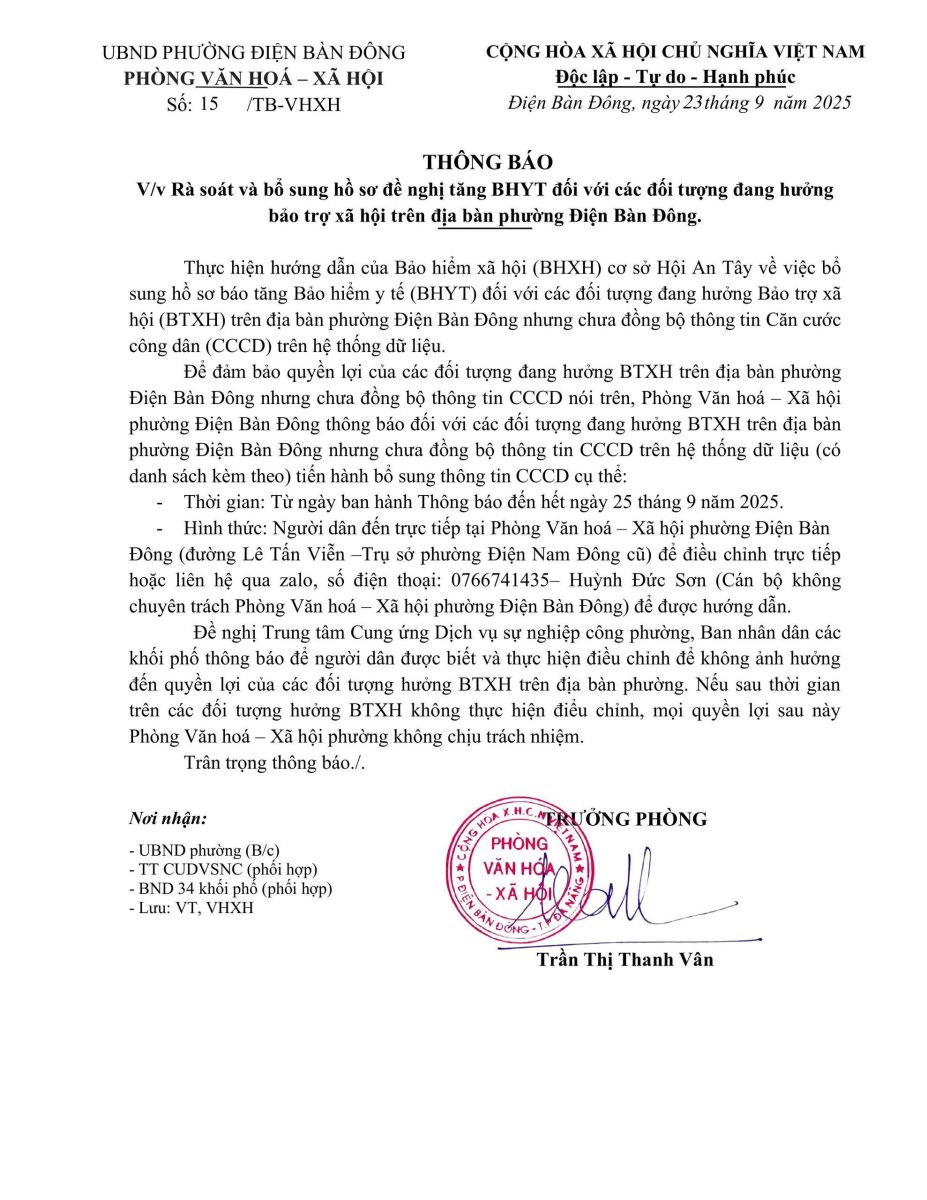 Thông báo rà soát và bổ sung hồ sơ đề nghị tăng BHYT đối với các đối tượng đang hưởng bảo trợ xã hội trên địa bàn phường Điện Bàn Đông.