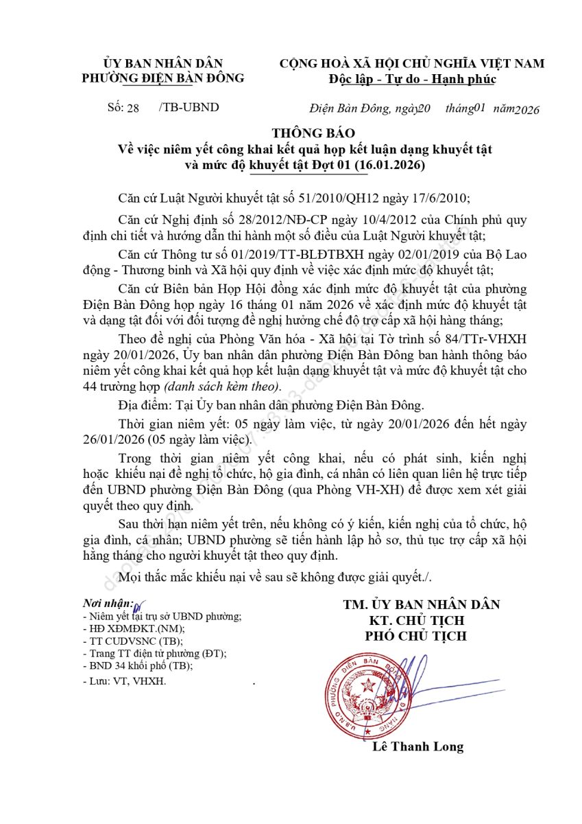 Niêm yết công khai kết quả họp kết luận dạng khuyết tật và mức độ khuyết tật Đợt 01 (16.01.2026)