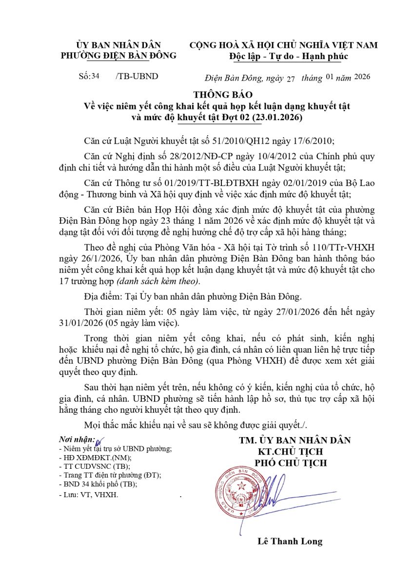 Thông báo về việc niêm yết công khai kết quả họp kết luận dạng khuyết tật và mức độ khuyết tật Đợt 02 (23.01.2026)